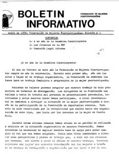 Código de Referencia / Reference code FMPB-1976-01 Organización feminista / Feminist Organization Federación de Mujeres Puertorriqueñas Título / Title Boletín Informativo No. 3, enero de 1976 Creado por / Creator Federación de Mujeres Puertorriqueñas-Junta Directiva Fecha de Publicación / Publication Date 1976-01-28 Tipo de Recurso / Resource Type Texto Localizacion / Location Colección Documentos del Feminismo Rivera Lassén-Crespo Kebler Colaboradoras / Contributors N/A Descripción / Description Boletín Informativo de la Federación de Mujeres Puertorriqueñas que conmemora un año de la creación de la federación y propone como objetivo una mejor organización administrativa. Además, informa al lector de las finanzas de la FMP y transmite un mensaje de la Comisión Legal. Quién lo Publica / Publisher Federación de Mujeres Puertorriqueñas Lenguaje / Language Español Notas / Notes N/A Temas / Subject N/A