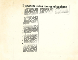 Código de Referencia / Reference code CDO-1986-BS Organización feminista / Feminist Organization Título / Title Bacardí usará menos el sexismo Creado por / Creator El Mundo Fecha de Publicación / Publication Date 1986/01/16 Tipo de Recurso / Resource Type Artículo en periódico Localizacion / Location Colección Documentos del Feminismo Rivera Lassén- Crespo Kebler Colaboradoras / Contributors Descripción / Description Quién lo Publica / Publisher El Mundo Lenguaje / Language Español Notas / Notes Temas / Subject publicidad, Bacardí Corporation, Cerdos de Oro, mujer anuncios cine y televisión.