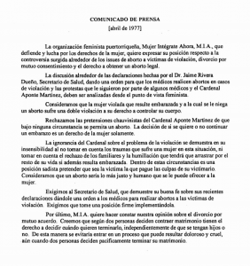 Código de Referencia / Reference code MIA-1977-CAV Organización feminista / Feminist Organization Mujer Intégrate Ahora Título / Title Comunicado sobre aborto para victimas de violación Creado por / Creator Mujer Intégrate Ahora Fecha de Publicación / Publication Date abril de 1977 Tipo de Recurso / Resource Type Comunicado Localizacion / Location Colección Documentos del Feminismo Rivera Lassén-Crespo Kebler Colaboradoras / Contributors N/A Descripción / Description N/A Quién lo Publica / Publisher Mujer Intégrate Ahora Lenguaje / Language Español Notas / Notes N/A Temas / Subject Mujer Intégrate Ahora, Organización feminista puertorriqueña, Violación, Aborto