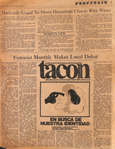 Código de Referencia / Reference code CETC-1975-TSJS Organización feminista / Feminist Organization MIA Título / Title Feminist Monthly Makes Local Debut Creado por / Creator Maldonado, Penny Fecha de Publicación / Publication Date 1975-01-10 Tipo de Recurso / Resource Type Texto Localizacion / Location Colección Documentos del Feminismo Rivera Lassén-Crespo Kebler Contribuidoras / Contributors N/A Descripción / Description Artículo publicado en el San Juan Star sobre el primer número de El Tacón de la Chancleta. Se describen los artículos y contenido de dicho número. Quién lo Publica / Publisher The San Juan Star (San Juan, P.R.) Lenguaje / Language Inglés Notas / Notes Digitalización del ejemplar y metadatos elaborados por The Caribbean Diaspora Project Temas / Subject Feminism, El Tacon de la Chancelta, women in journalism, Puerto Rico